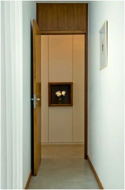 At first glance, the house appears as an enclosed volume—an understated box presenting a 3.5-meter-high wall to the street. This gesture eliminates the need for fences or gates, while offering a public garden at the front. In contrast, once inside and walking along the side path, the occupant discovers a seamless integration between interior and exterior spaces. This effect is achieved through pivoting wooden doors on the side façade and sliding doors at the rear—both crafted from reclaimed wood sourced through circular economy practices.